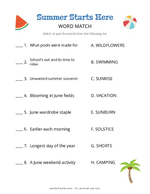 Download free printable Summer Starts Here Word Match PDF to print on letter size paper.